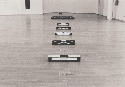 Rituale Begegnungen, 11-teilig,1998, Spanplatte, Spiegel, Gläser, Teelöffel, Papier