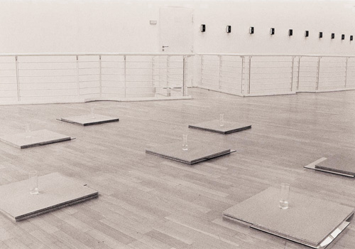 Rituale Begegnungen, 9-teilig, 1998, Spanplatte, Glas, Trinkgläser